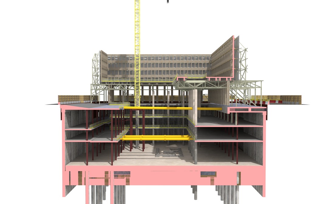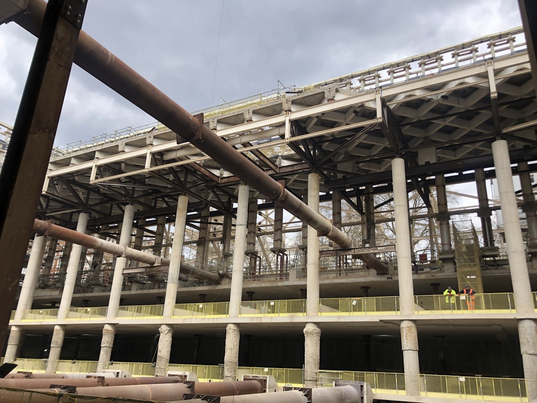The temporary works was designed to allow as much bulk demolition as possible, while internal temporary works were designed to allow the internal piling to take place.