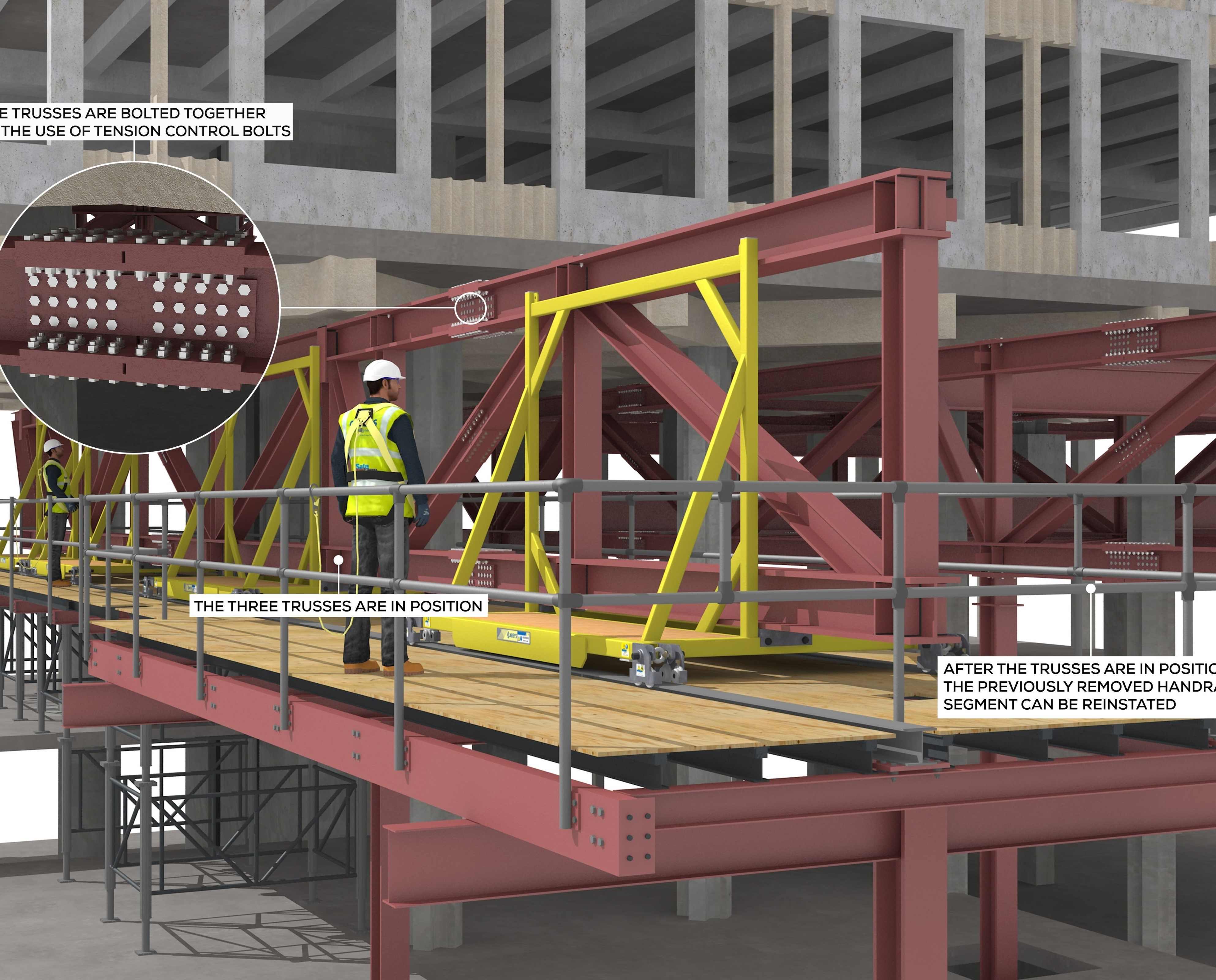 We then designed the steelwork plunge columns, and piles, along with the vertical supporting trusses. Installing the 25m trusses would be a challenge, so careful planning and modelling of how the tursses would be delivered to the central city site and thread through the existing windows was carried out.